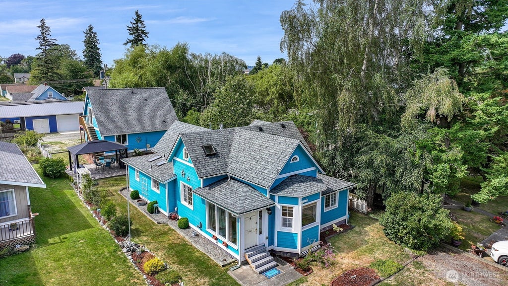 Historic Victorian home in the Salishan neighborhood oozes with charm. Whitewashed exposed trusses, original fir floors in living & dining rooms, brick enclosure for a freestanding stove (plumbed for gas), and French doors. Upstairs loft bedroom with skylights and private roof deck. New siding, roof, and heat pump installed in 2017. The 2018-built detached 784 SQFT garage/shop has a half bathroom and a 420 SQFT guest suite above with exterior access. The suite has a living room with wet bar, bedroom, full bathroom and walk-in closet with a combo washer/dryer. Huge outdoor patio with gazebo. Off-street parking for 5+ vehicles and/or RV/boat/trailer. Assumable VA loan at 2.875% interest rate!
