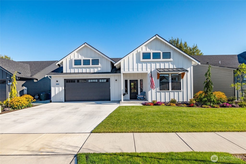 Just like new but with the benefit of more developed landscaping and a feel of "home". This single level floor plan has a great open concept. Wide entryway leads to an expansive great room, vaulted ceilings, gas fireplace & LVP flooring. Kitchen with Quartz counters, gas range, 36" upper Blonde cabinets, ample storage & great size island for functionality. All upgraded lighting & plumbing fixtures. Utility room has ample storage adjacent to the kitchen. Mini splits provide heat/AC. The primary bedroom has vaulted ceilings, ensuite bath w/a tile floor & shower, double sinks and walk in closet. Two generous guest bedrooms with lots of light. Private covered patio with beautiful yard fully landscaped & fenced w/plenty of room for gardening.