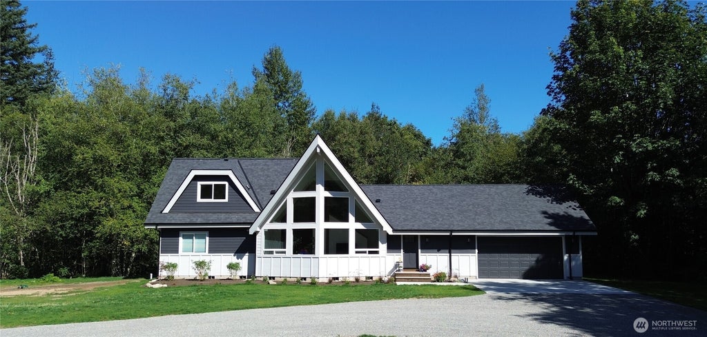 Welcome to your private retreat on just under 5 acres! This beautifully remodeled home features stunning A-frame windows, a brand-new kitchen, updated baths, new roof, flooring, and efficient heat pump. Everything is new in this home! The main floor offers 2 bedrooms (including en-suite) plus an office, while the upper level boasts a spacious primary suite and bonus room. A massive 2,400 sq ft shop provides endless potential—complete with a fully renovated 2-bed ADU, ideal for guests, rental, or multigenerational living. Peaceful and secluded, yet minutes to I-5, lakes, and trails. A rare gem—don’t miss it!
