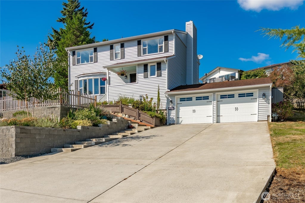 Wake up to breathtaking views of Galbraith Mt, Ferndale Valley, and the San Juan Islands from this spacious 5+ bedroom home! The main living room, rooftop deck, and primary suite all showcase stunning vistas. The finished 1,128 SF basement w/full bath and MIL plumbing offers flexible space for guests, office, or studio. Enjoy over a 1/4 acre w/ fruit trees, garden beds & room to entertain. The primary suite features an updated ensuite & walk-in closet. Updates include a partially remodeled kitchen w/ new range/oven, hood vent & countertops, ductless A/C & heat, efficient gas FP insert, new concrete driveway & stairs, engineered retaining walls, improved drainage, leveled yard & refreshed landscaping. Close to schools, shopping, parks & I-5.