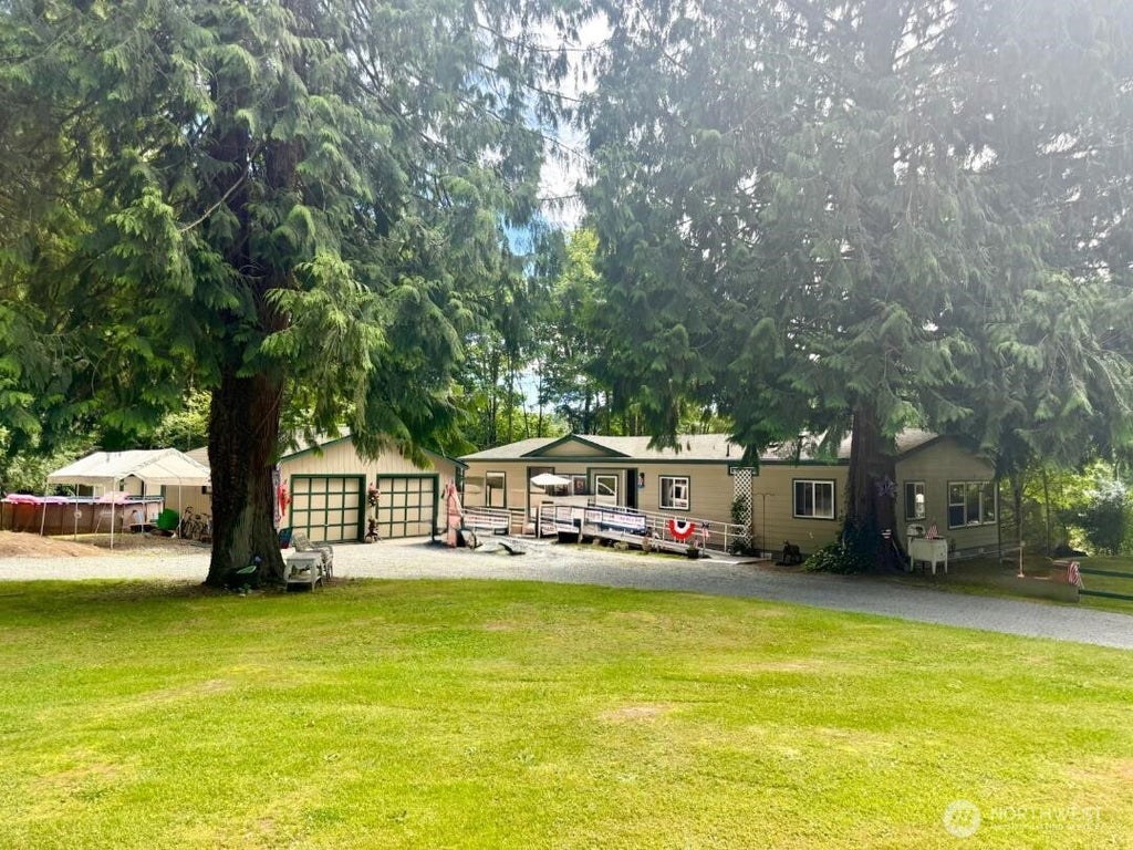 This home sits atop a hill overlooking Prairie rd.This unique Park-like setting property sits on 2acres.Primary bedroom located off living room with master bathroom, two guest bedrooms on other side of home w/guest bathroom. Handicap accessible. This home has an open concept from kitchen to dining room and family room. Walk out your sliding door to a beautiful deck overlooking your yard. Included is a gazebo and firepit, greenhouse and a pool for those warm summer days. There is a 24x24 detached car garage plus a 16x24 storage shed insulted and sheet rocked. Room for all your toys. Close enough to I-5 for easy commutes to all amenities, yet still peaceful when home. Fire station less than a block away.