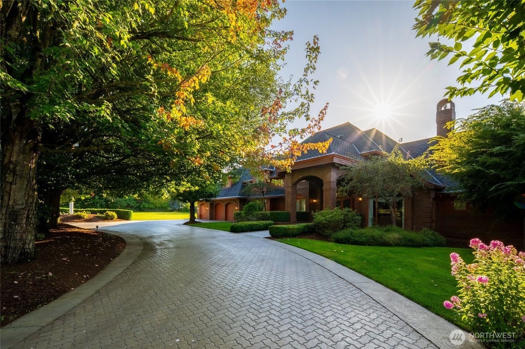 Welcome to your private Pacific Northwest retreat-nearly 5 acres at the end of a quiet dead-end road, where privacy and craftsmanship unite. A gated entry opens to an expansive paver driveway with circular approach, framed by mature trees and landscaping, leading to a covered arched portico. Inside, a dramatic 24-foot two-story foyer and sweeping curved staircase make a stunning first impression. Main level offers a formal living room with arched window and gas fireplace, formal dining provides the perfect setting for memorable gatherings, and a well-appointed kitchen with stainless appliances, granite counters, walk-in pantry, built-in desk, bar seating, and breakfast nook flowing into the great room with French doors and wood-burning fireplace. The large primary suite on the main offers a tray ceiling, French doors to the covered deck, and a spacious walk-in closet. Also downstairs are a dedicated den/office and a dreamy laundry room. Upstairs are four bedrooms with Jack-and-Jill baths, three featuring walk-in closets and charming window seating. An expansive rec room serves as the ultimate hangout destination, and a third-level flex space with storage adds versatility. Outdoor living shines with a covered timber-framed deck, vaulted wood ceiling, irrigated and fenced yard. A heated 3-car garage with half bath, basement garage, 4-bay shop with 44-foot RV bay and 3/4 bath, and a 1,000+ sq ft ADU with kitchen, bath, and covered balcony complete this exceptional gated estate.
